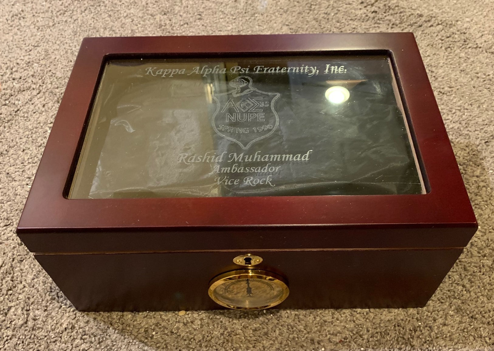 This is a customized Kappa Alpha Psi Fraternity Inc. engraved cigar humidor. The finish on the outside is cherry for a distinguished look. Three lines of text with a graphic/shield will be engraved or contact us for more options. Top of humidor engraved with the Fraternities shield or graphic of your liking. Beautiful craftsmanship. Holds 75-100 cigars. Humidor comes with hygrometer and humidifier and key.