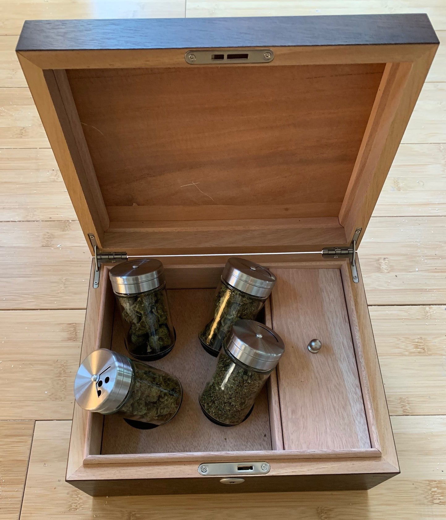 This is a custom humidor for herbal products such as sage, potpourri or wacky tobacky. Unit comes equipped with 4 glass jars and humidifier and extra storage space. Unit has a locking key to keep your items safe. This can be customized with your name, etc. This is made of pure mahogany and is an awesome product.